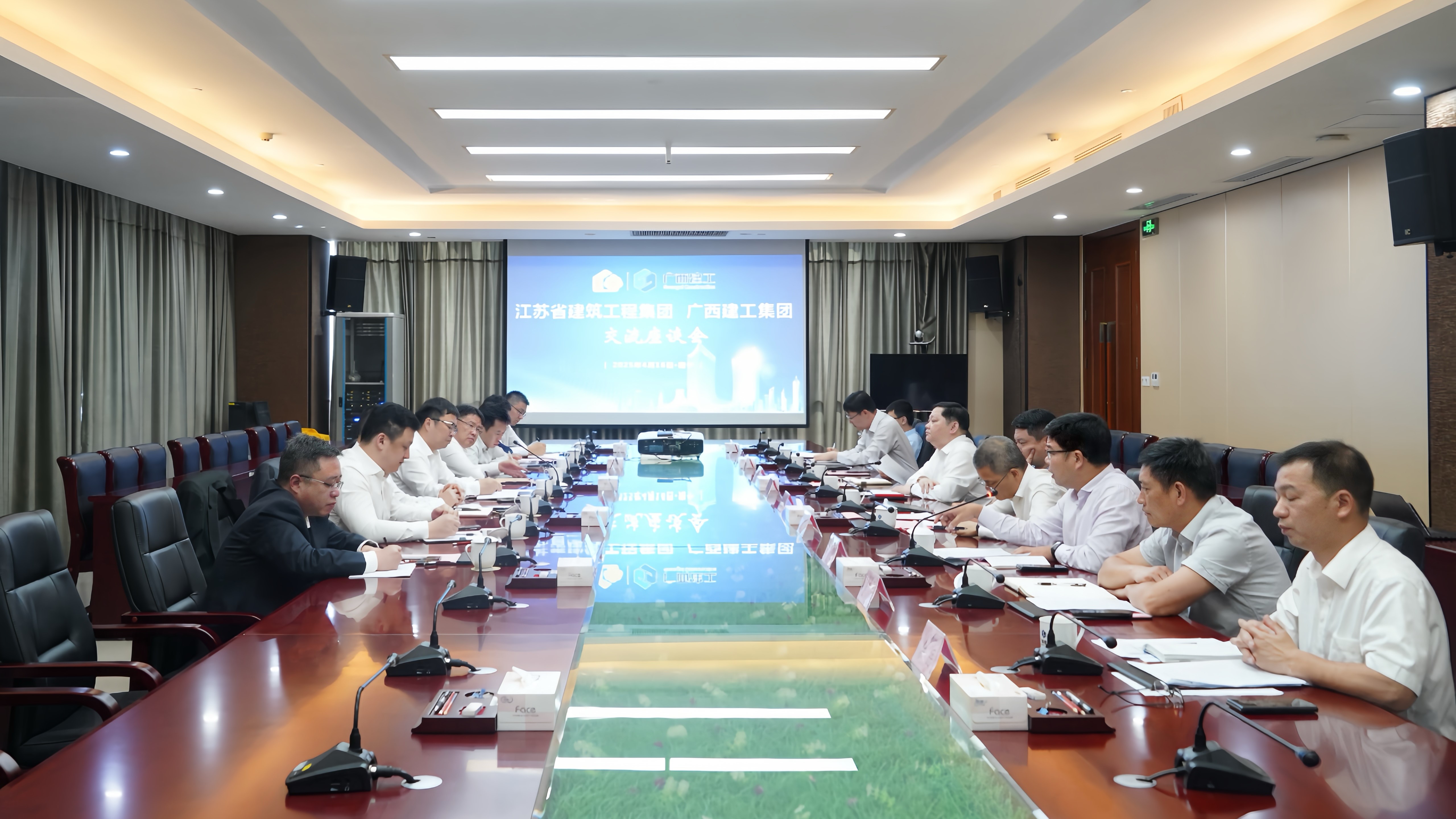 蔣寧對廣西建工的熱情接待表示感謝,并簡要介紹江蘇省建近期生產(chǎn)經(jīng)營情況。他指出,當(dāng)前建筑市場持續(xù)變化,行業(yè)都面臨著一些共性的挑戰(zhàn),廣西建工圍繞全年目標(biāo),在平臺建設(shè)、清收清欠、融資信貸、風(fēng)險化解等方面的優(yōu)秀經(jīng)驗以及搶抓政策和市場新機遇、應(yīng)對行業(yè)深度調(diào)整的有效策略值得江蘇省建借鑒和學(xué)習(xí)。希望雙方發(fā)揮各自優(yōu)勢,持續(xù)開展更深入的交流學(xué)習(xí),加強溝通對接,加大業(yè)務(wù)合作,實現(xiàn)經(jīng)驗共享、互促提升,攜手共贏發(fā)展。